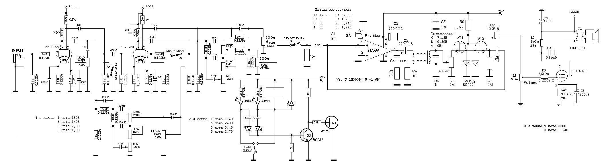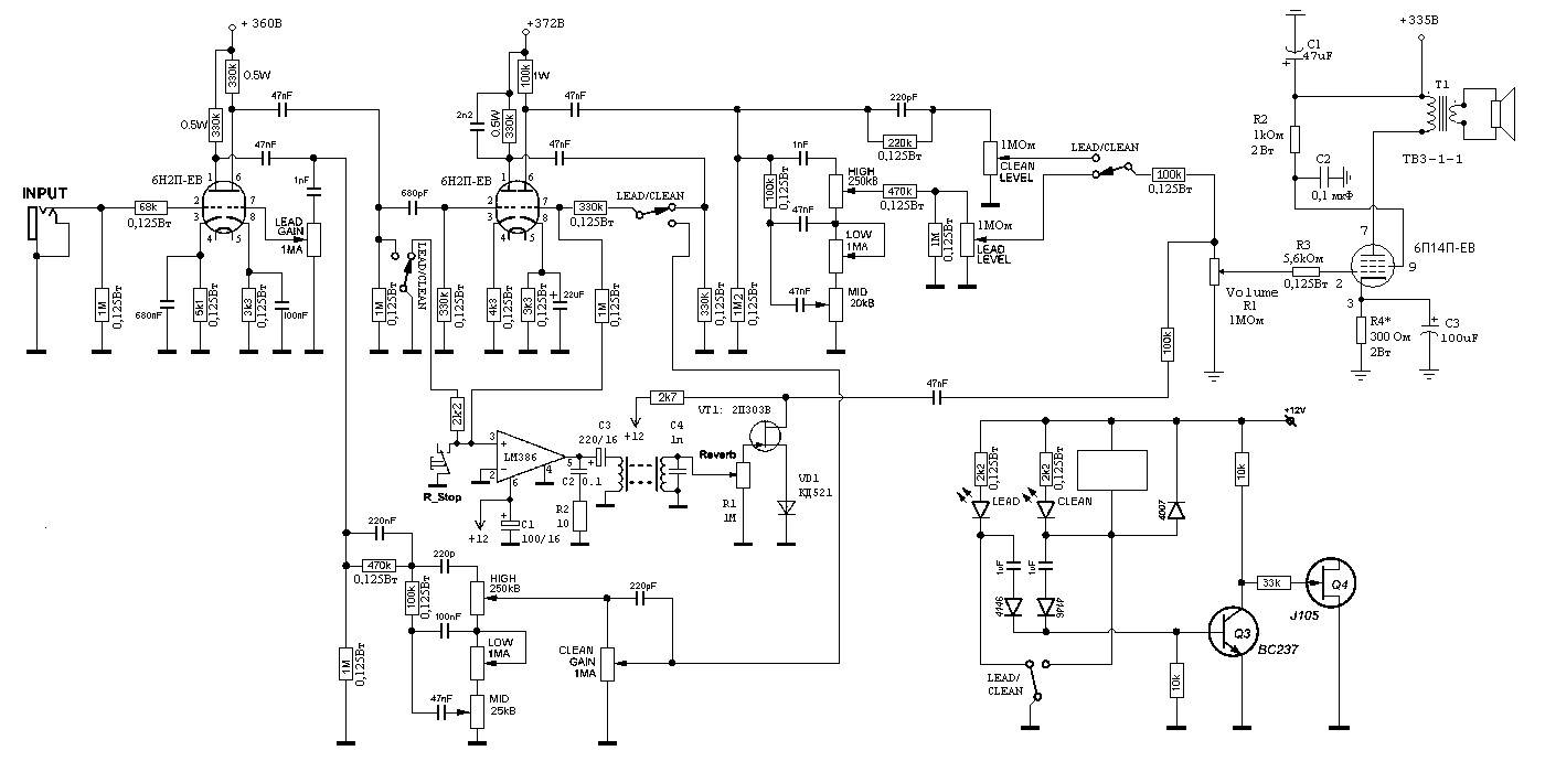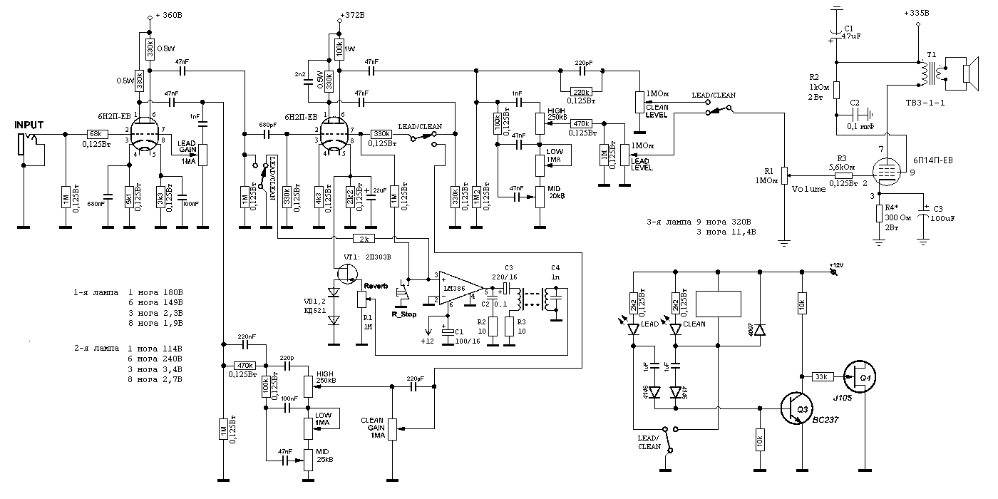 Итак, вот что я родил, раз уж мощник не раскачивается полупроводниками без изрядного гемора... Смотри на последний каскад, что у переключателя клин/лид. Резюк на 1мег дополняешь снизу резюком 10ком и подаешь на лмку с точки деления. С лмки на ревер, это понятно. Далее, убираешь из катода резюк и кондер. Ставишь полевик кп303г/303е/бф245ц или аналогичный сильноточный с пн переходом стоком к катоду, истоком к двум диодам кд521 или аналогичных последовательно, их в землю. На затвор сигнал с ревера через регулятор 1мег. Не айс то, что в ревер подмешивается в грузящийся каскад, но что делать? В пиви 5150 комбо сделано именно так, никто не жалуется, да и в перегрузе такая каша, что хрен там разберешь где ревер) |