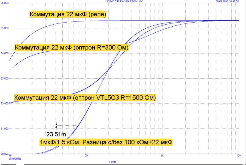 Beermonza, полагающий, что можно услышать разницу в +0,023 дБ на НЧ, советует 22 мкФ подключать с помощью оптрона. Берём общеупотребительный в гитарных преампах (например, в Triaxis) VTL5C3 с Ron 1,5 кОм и некий усреднённый низкоомный с Ron 300 Ом. Симулируем, наслаждаемся (внизу графика - влияние той самой паразитной цепочки 22 мкФ/100 кОм):