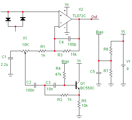 Вот я подумал, при использовании активных EQ нужно учитывать амплитудный диапазон. При ограничении диодами сигнала до уровня 0.6В с однополярным питанием 9 Вольт даже rail-to-rail ОУ будет клипить в максимальной эквализации. Либо напряжение питания нужно увеличивать Вольт до 15, либо усиление дополнительное не надо там, либо горб уменьшать до 6дБ имхо... |