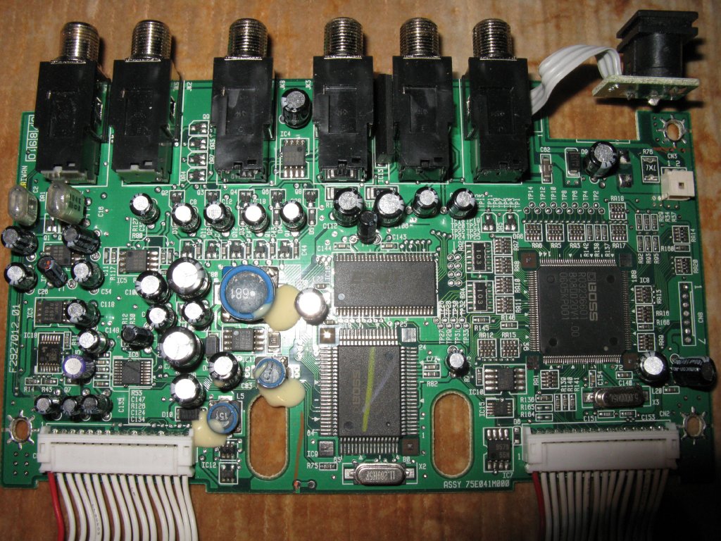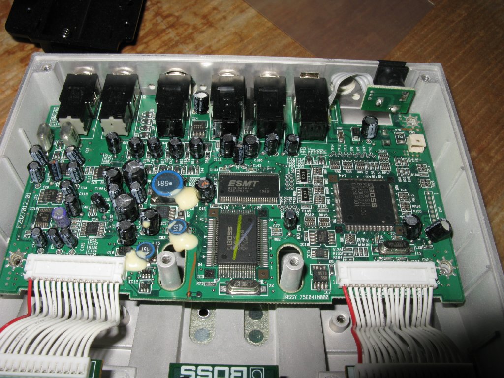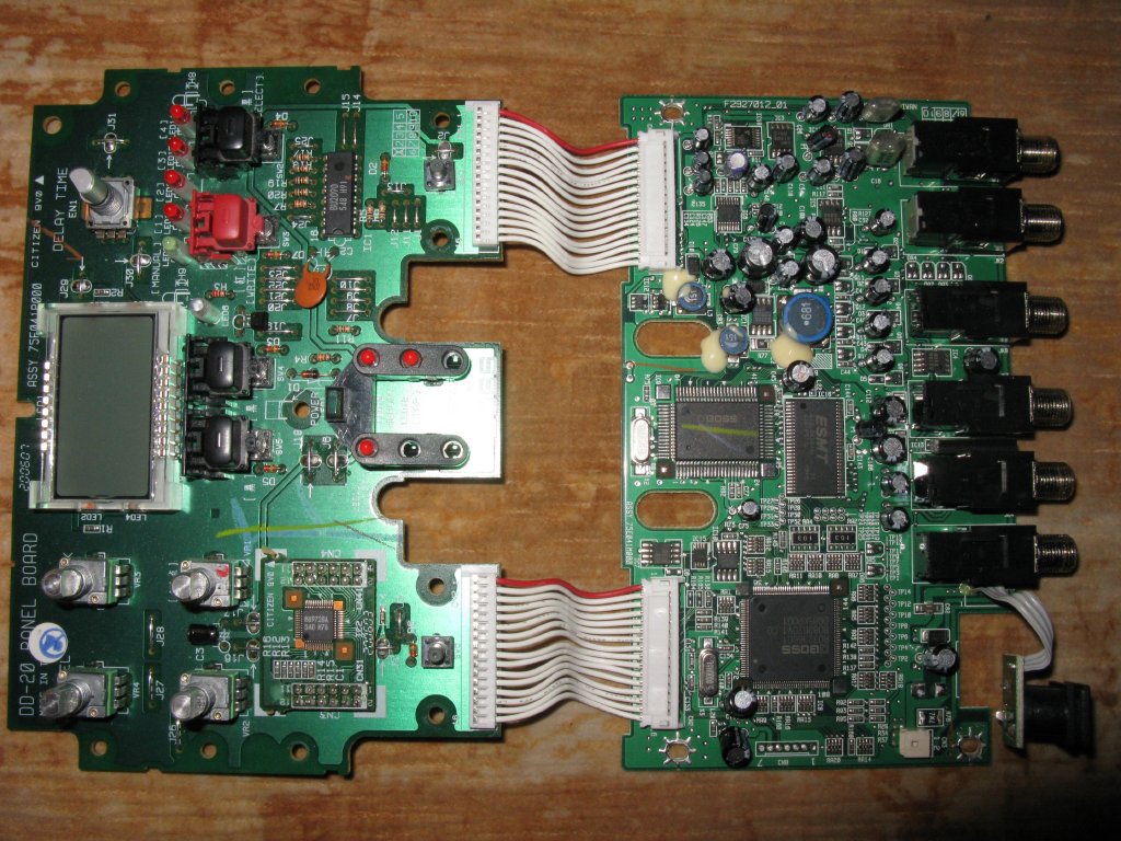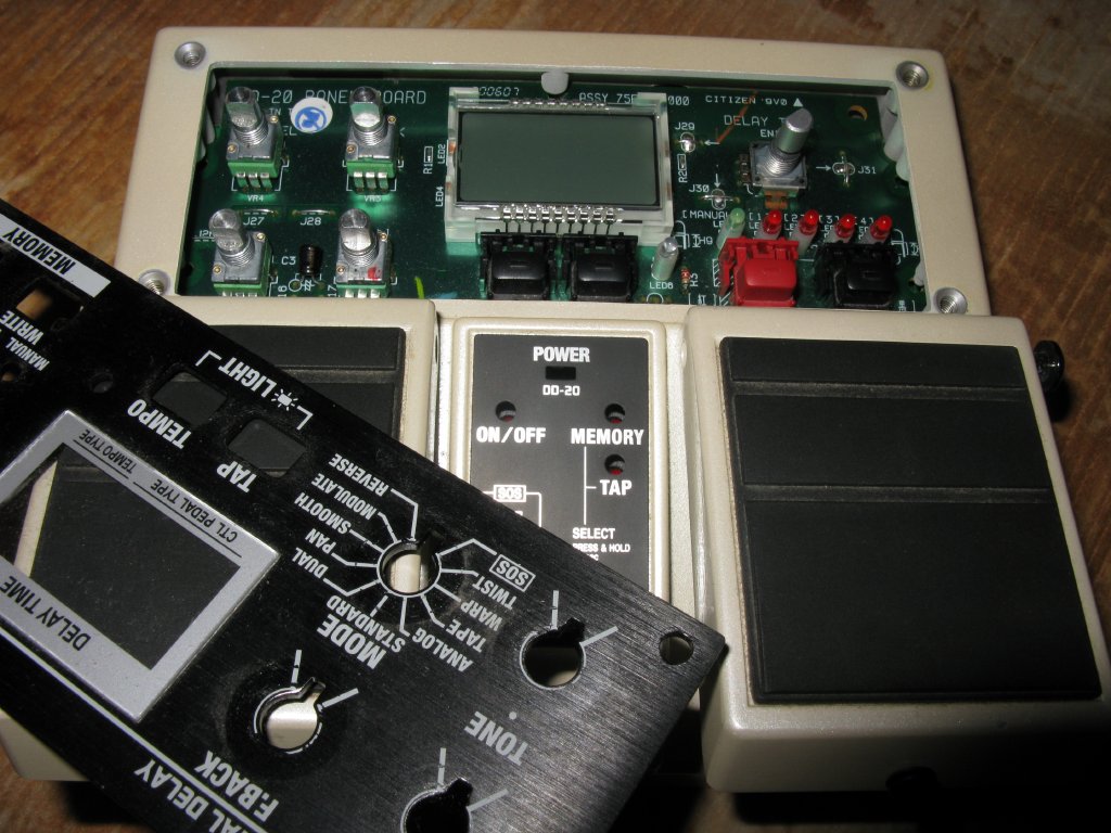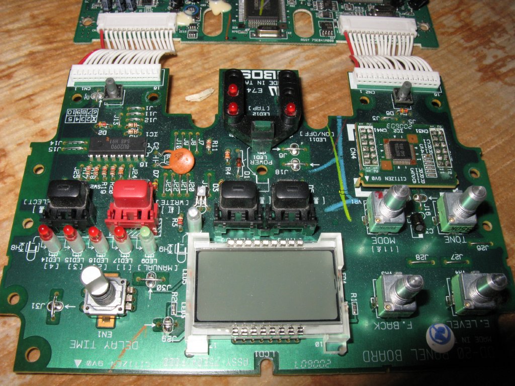 Видно аналоговую часть, dc/dc конвертор(ы?). В центре снизу dsp-чип, прямо над ним память. Справа управляющий контроллер (и везде маркировка Boss, хехе). Плата под управления значительно более лоуфайная. Выводные компоненты, местами с обратной стороны неотмытый флюс. На отдельной платке ЖК-драйвер от Citizen. Корпус унифицированный для всех двойный боссовских педалек. Видно неиспользованное отверстие, закрытое накладкой с задней стороны ... ... и накладную лицевую панель для конкретной педали. |